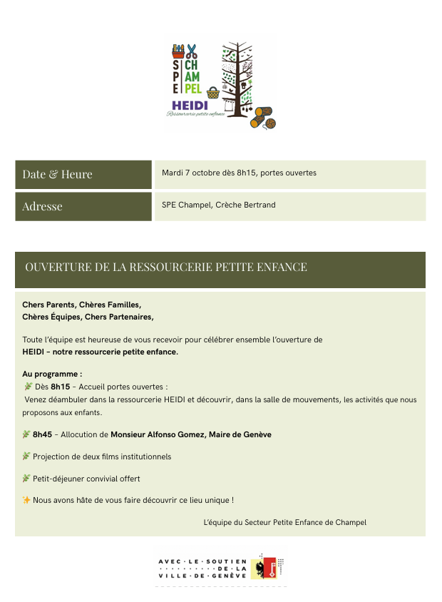 Le Comité, la Direction et les Equipes du Secteur Petite Enfance de Champel sont heureuses de vous convier à l’inauguration – portes ouvertes de leur nouvel espace « la ressourcerie petite enfance HEIDI »