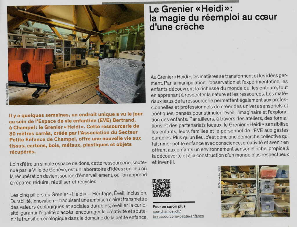 Créée en 2025, « la ressourcerie petite enfance » baptisé le Grenier « Heidi » est un Espace Dédié à l’Écologie, au Développement Durable et à la Créativité.
