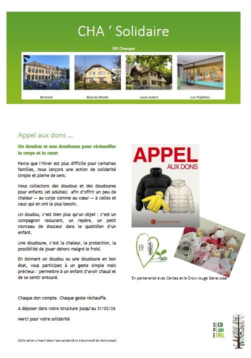La mission générale du SPE de Champel est l ‘accueil de jour régulier d’enfants n’ayant pas atteint l’âge de la scolarité obligatoire. Elle est guidée par la conviction que chaque enfant, bien portant ou à besoins éducatifs particuliers (BEP), a le droit de bénéficier d’un accueil et d’une prise en charge de qualité, quelle que soit sa situation personnelle, familiale ou sociale.
